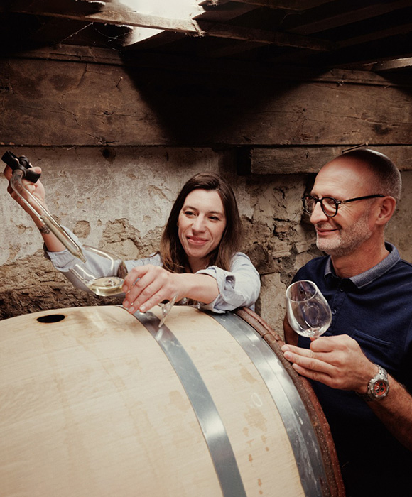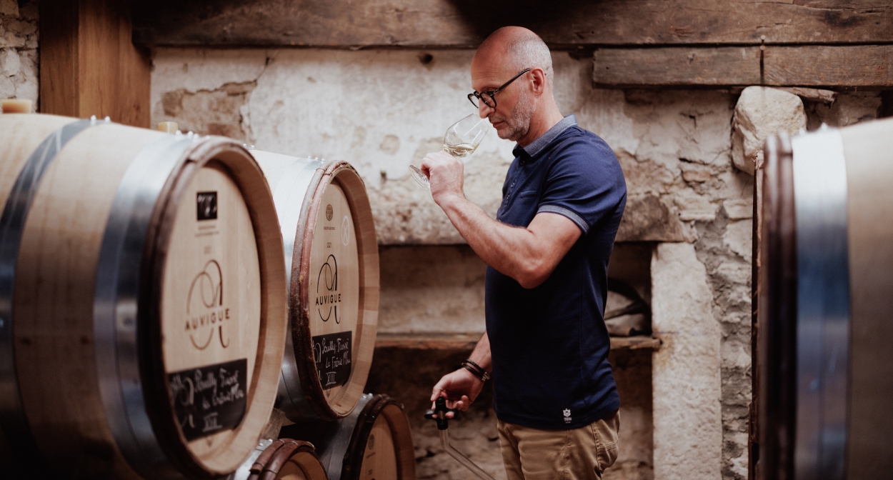 Céline Hirsh, die zich in 2018 bij het wijnbedrijf voegt, houdt toezicht op de wijngaard en de wijnmakerij. Met Sylvain zit ze op dezelfde golflengte: geen concessies en weinig compromissen. Deze aanpak wordt ook toegepast in de wijnmakerij. Ze geloven allebei dat elke interventie gerechtvaardigd moet zijn en tot een minimum moet worden beperkt, of het nu gaat om conventionele of biologische wijnen. Versnippering van het proces is ondenkbaar, de wijnen moeten de vrijheid hebben om zichzelf te onthullen. De focus ligt op de vaten die de kostbare nectar beschermen en geduldig bijdragen aan de evolutie van de wijn. Alle Auvigue-wijnen zijn op Frans eiken opgevoed, de een wat meer dan de ander.